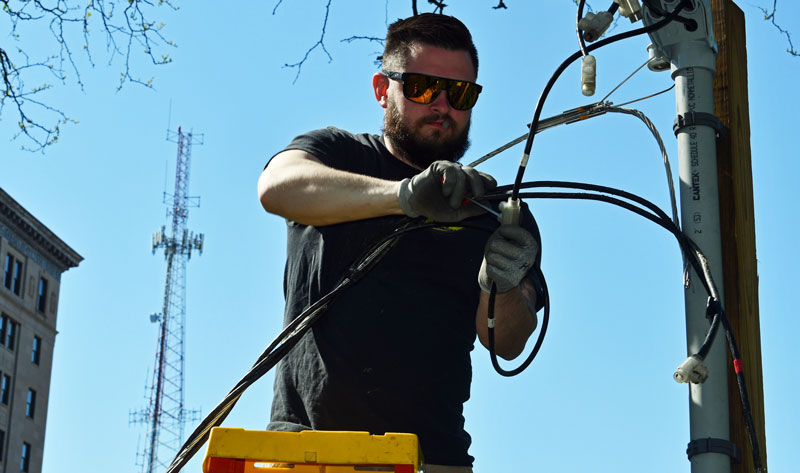 Mike Rowbotham, a fourth-year commercial electrician apprentice, was among those on hand Monday morning helping set up power for this weekend’s Warren Relay for Life.