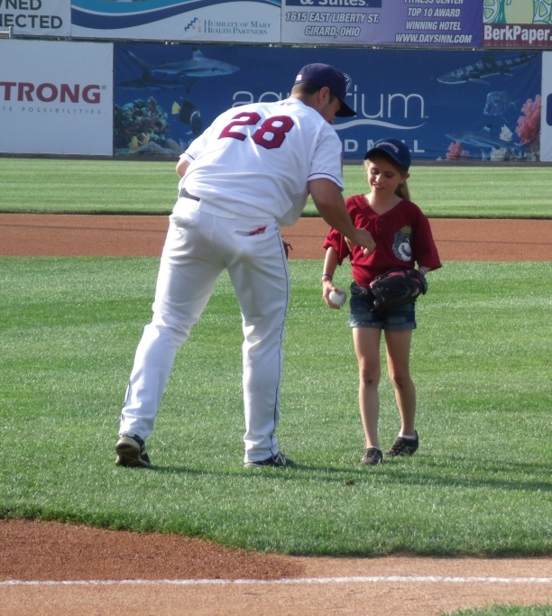 Madison Skok took the mound in place of her father, Staff Sgt. James Skok of Austintown, to throw out the ceremonial first pitch at the Mahoning Valley Scrappers home opener. The Skoks received the opportunity from NECA-IBEW Electricians. Scrappers pitcher J.P. Feyereisen played the role of catcher.